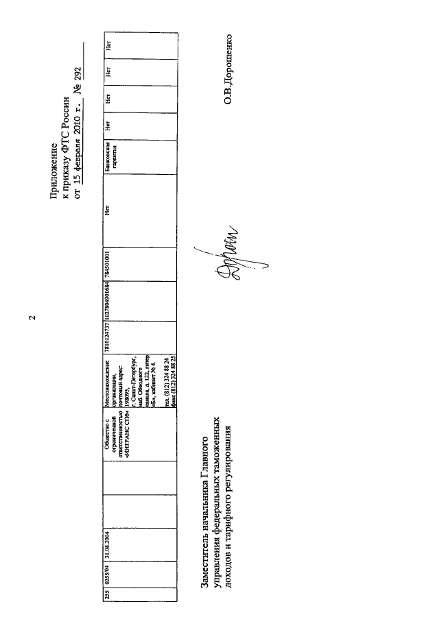ПРИКАЗ ФТС РФ от 15.02.2010 N 292