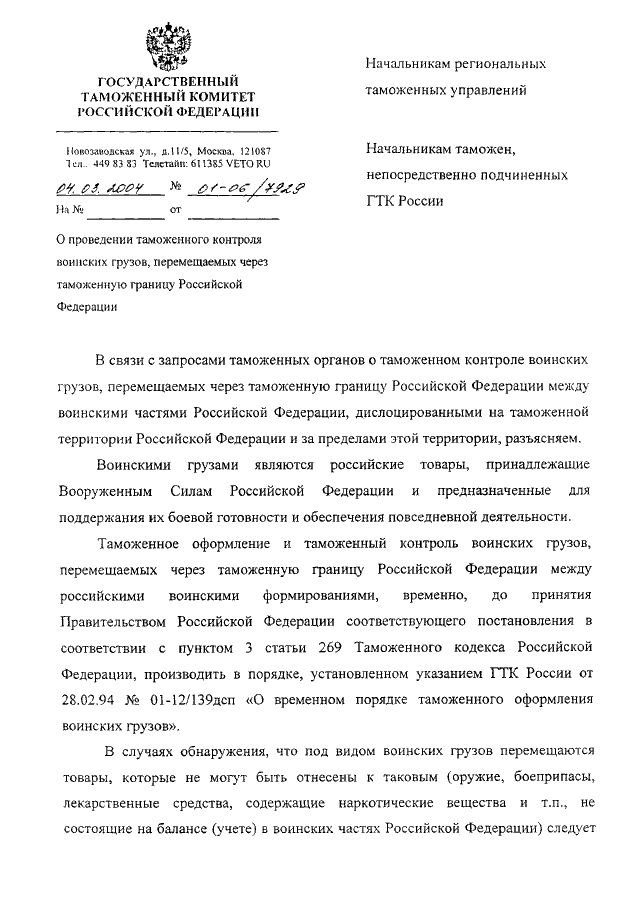 ПИСЬМО ГТК РФ от 04.03.2004 N 01-06/7929