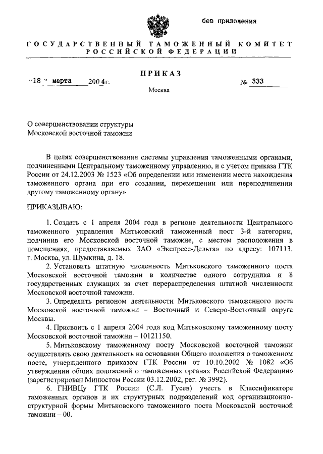 ПРИКАЗ ГТК РФ от 18.03.2004 N 333