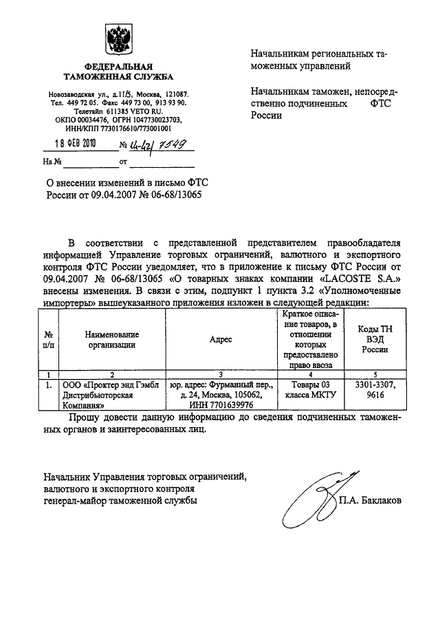 "О ВНЕСЕНИИ ИЗМЕНЕНИЙ В ПИСЬМО ФТС РОССИИ ОТ 09.04.2007 N 06-68/13065"