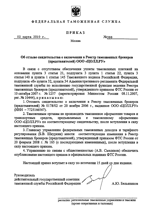 "ОБ ОТЗЫВЕ СВИДЕТЕЛЬСТВА О ВКЛЮЧЕНИИ В РЕЕСТР ТАМОЖЕННЫХ БРОКЕРОВ (ПРЕДСТАВИТЕЛЕЙ) ООО "ЦОЛЛ.РУ"