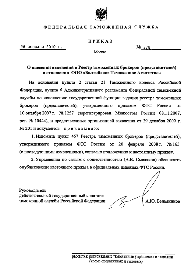 ПРИКАЗ ФТС РФ от 26.02.2010 N 378