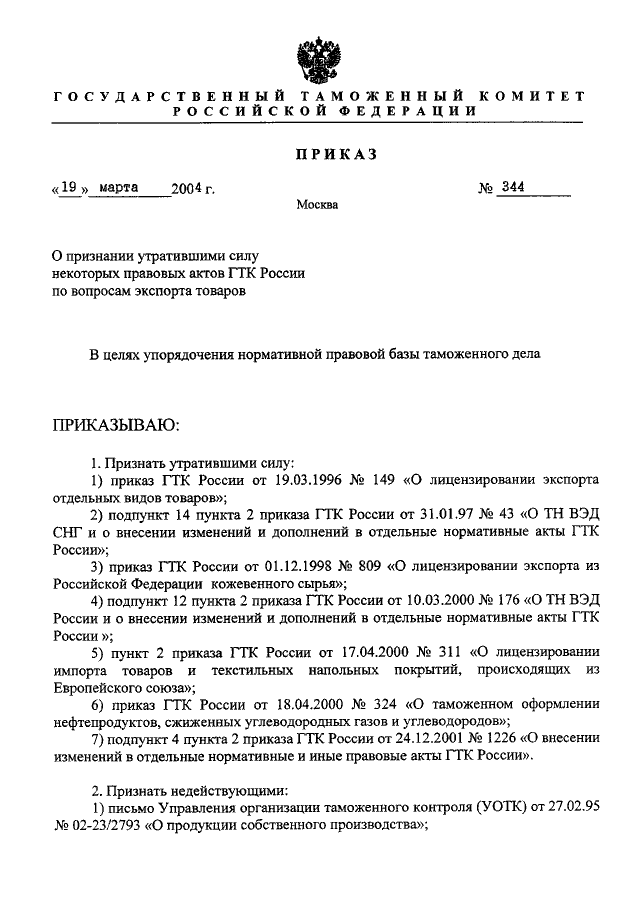 ПРИКАЗ ГТК РФ от 19.03.2004 N 344