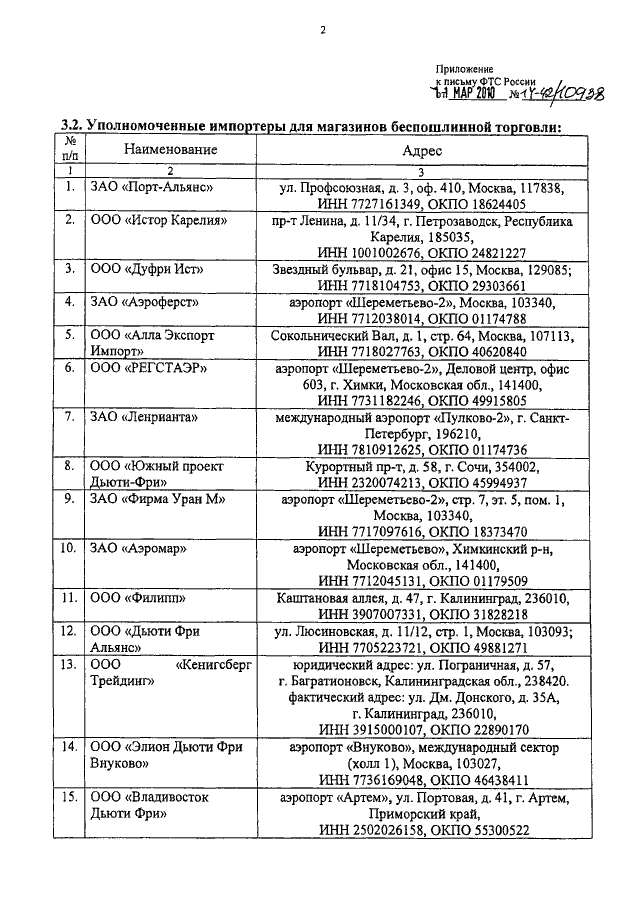 ПИСЬМО ФТС РФ от 11.03.2010 N 14-42/10938