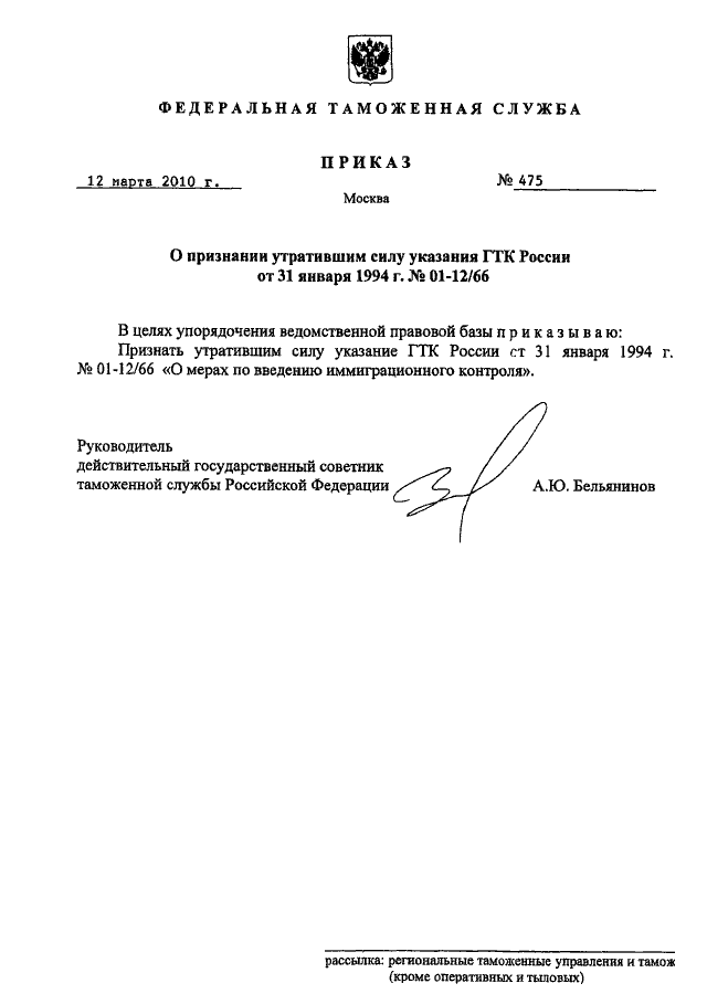 ПРИКАЗ ФТС РФ от 12.03.2010 N 475