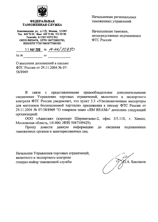 ПИСЬМО ФТС РФ от 11.03.2010 N 14-42/10950