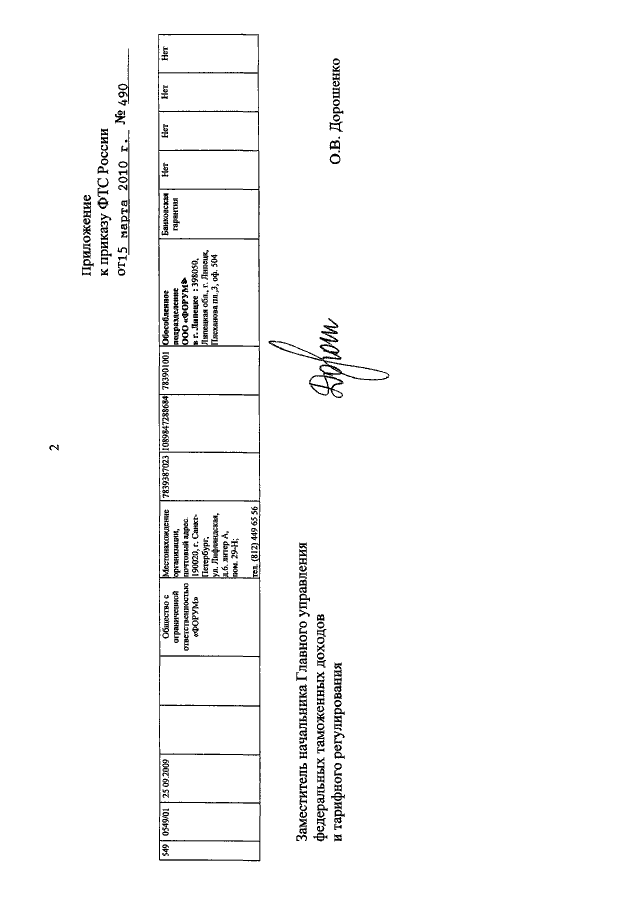 ПРИКАЗ ФТС РФ от 15.03.2010 N 490