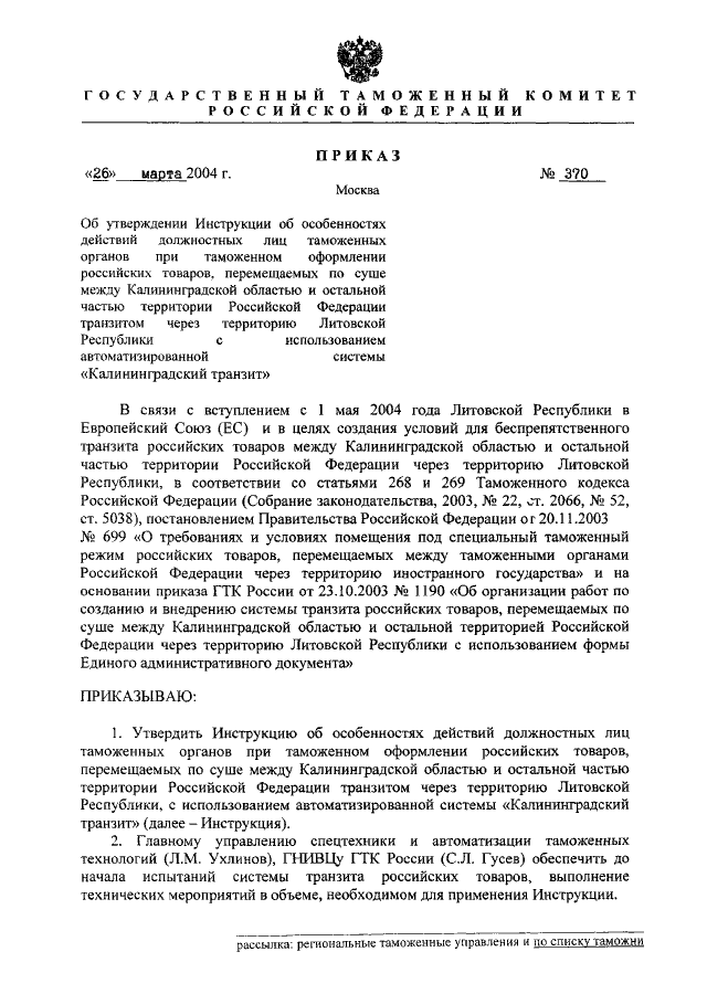 ПРИКАЗ ГТК РФ от 26.03.2004 N 370
