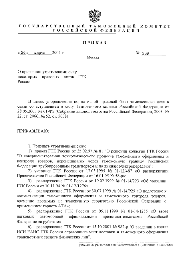 ПРИКАЗ ГТК РФ от 26.03.2004 N 369