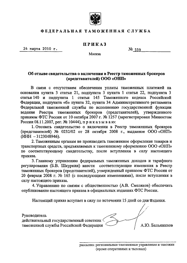 "ОБ ОТЗЫВЕ СВИДЕТЕЛЬСТВА О ВКЛЮЧЕНИИ В РЕЕСТР ТАМОЖЕННЫХ БРОКЕРОВ (ПРЕДСТАВИТЕЛЕЙ) ООО "ОНП"