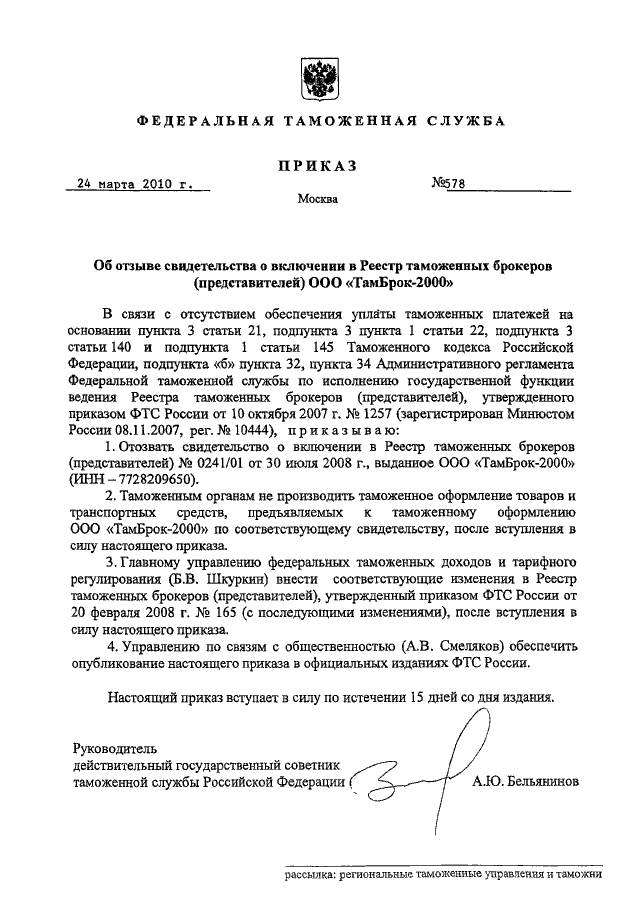 ПРИКАЗ ФТС РФ от 24.03.2010 N 578