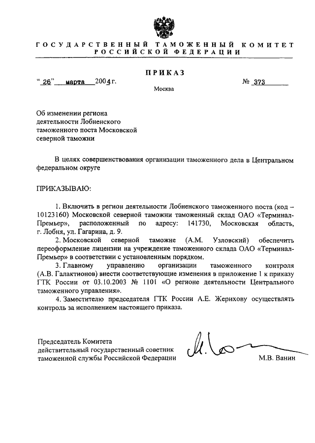 ПРИКАЗ ГТК РФ от 26.03.2004 N 373