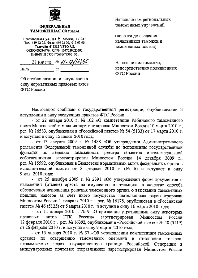 "ОБ ОПУБЛИКОВАНИИ И ВСТУПЛЕНИИ В СИЛУ НОРМАТИВНЫХ ПРАВОВЫХ АКТОВ ФТС РОССИИ"