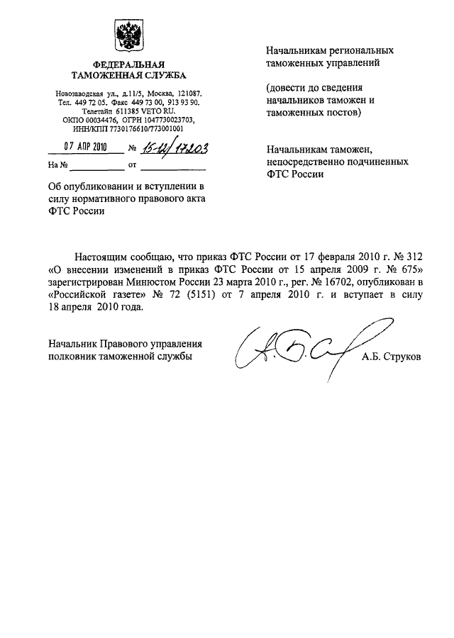 "ОБ ОПУБЛИКОВАНИИ И ВСТУПЛЕНИИ В СИЛУ НОРМАТИВНОГО ПРАВОВОГО АКТА ФТС РОССИИ"