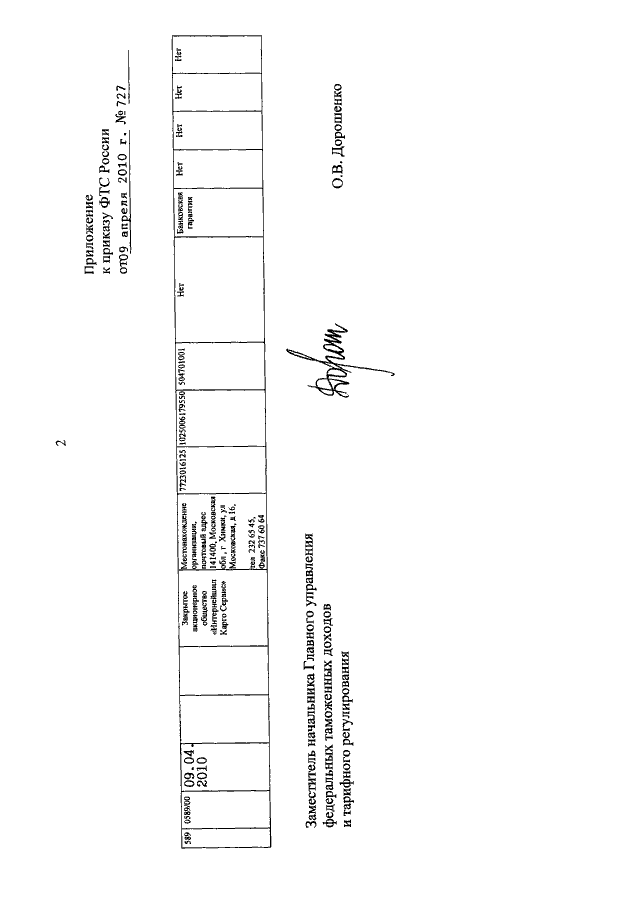 ПРИКАЗ ФТС РФ от 09.04.2010 N 727