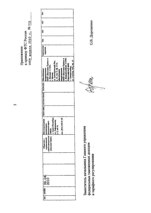 ПРИКАЗ ФТС РФ от 09.04.2010 N 731