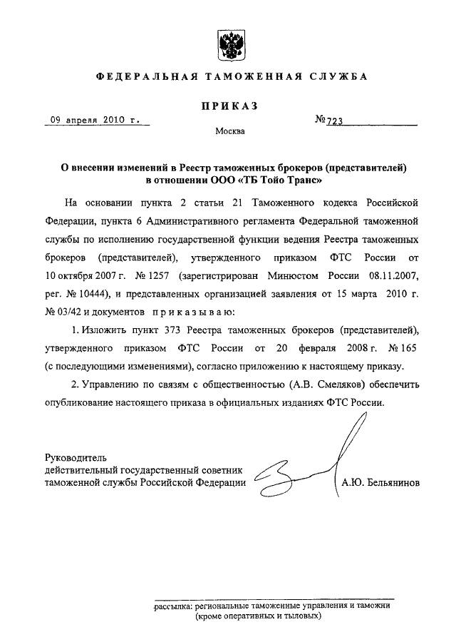 ПРИКАЗ ФТС РФ от 09.04.2010 N 723
