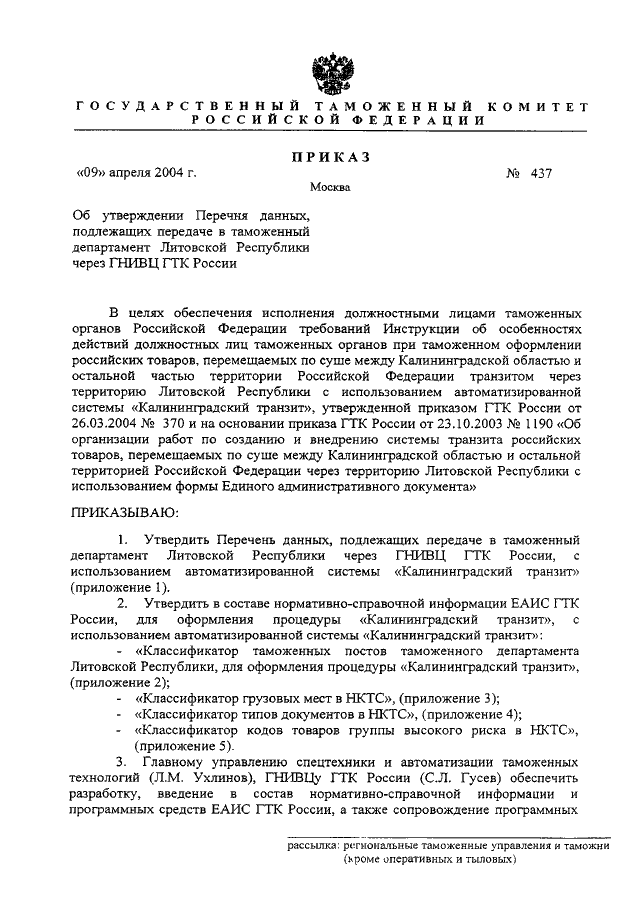 ПРИКАЗ ГТК РФ от 09.04.2004 N 437