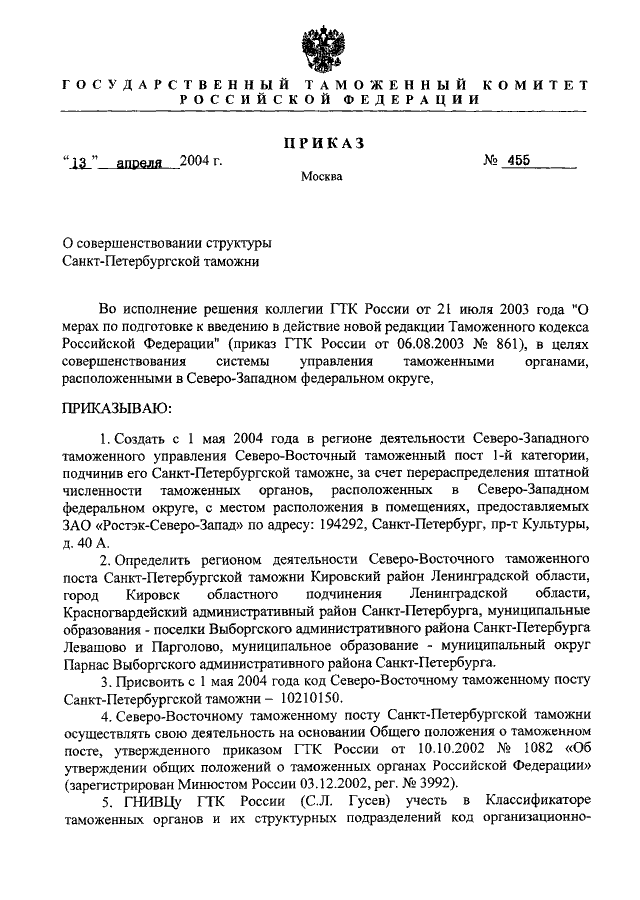 ПРИКАЗ ГТК РФ от 13.04.2004 N 455