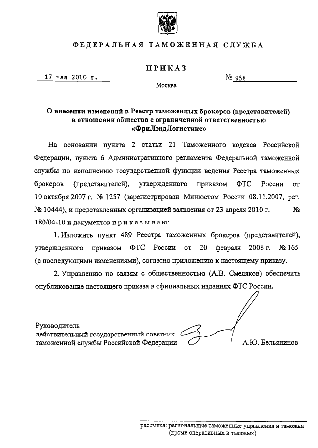 "О ВНЕСЕНИИ ИЗМЕНЕНИЙ В РЕЕСТР ТАМОЖЕННЫХ БРОКЕРОВ (ПРЕДСТАВИТЕЛЕЙ) В ОТНОШЕНИИ ОБЩЕСТВА С ОГРАНИЧЕННОЙ ОТВЕТСТВЕННОСТЬЮ "ФРИЛЭНДЛОГИСТИКС"
