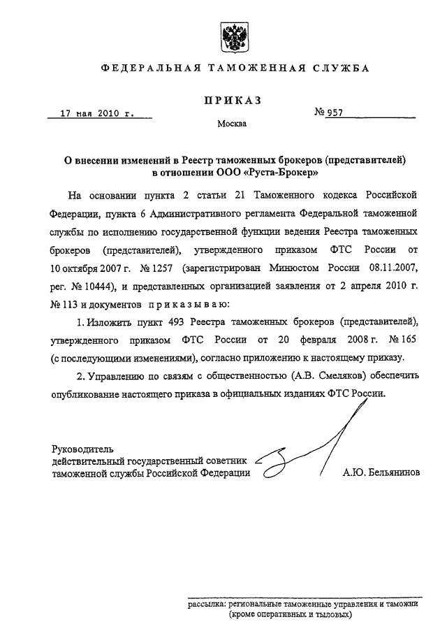 ПРИКАЗ ФТС РФ от 17.05.2010 N 957