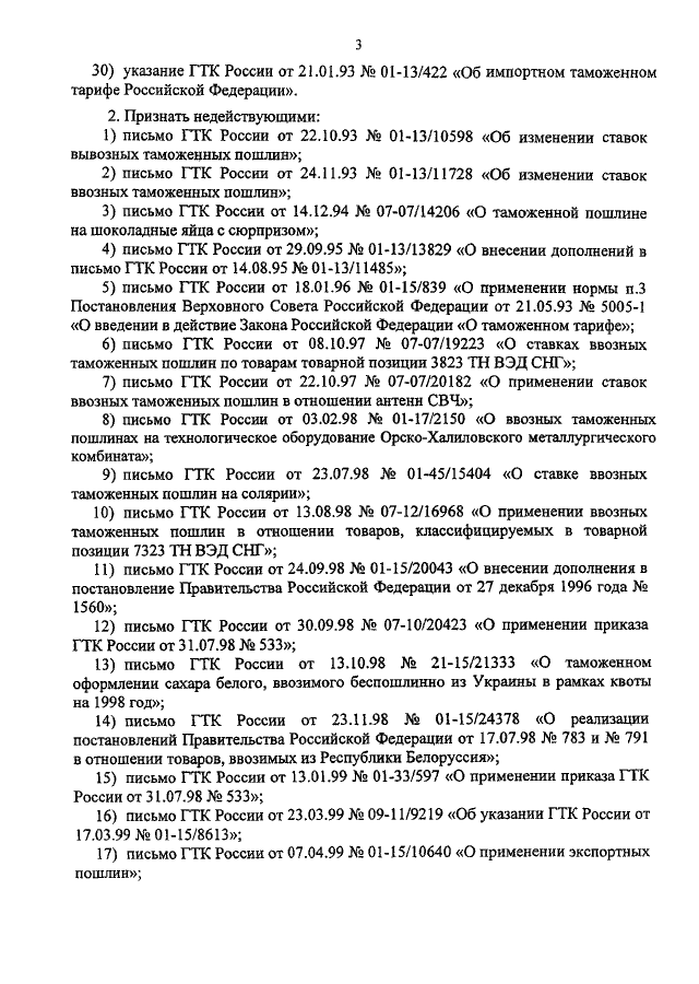 "О ПРИЗНАНИИ УТРАТИВШИМИ СИЛУ НЕКОТОРЫХ ПРАВОВЫХ АКТОВ ГТК РОССИИ ПО ВОПРОСАМ ТАРИФНОГО И НЕТАРИФНОГО РЕГУЛИРОВАНИЯ"