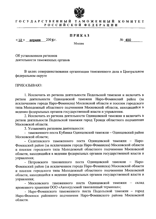 ПРИКАЗ ГТК РФ от 12.04.2004 N 450