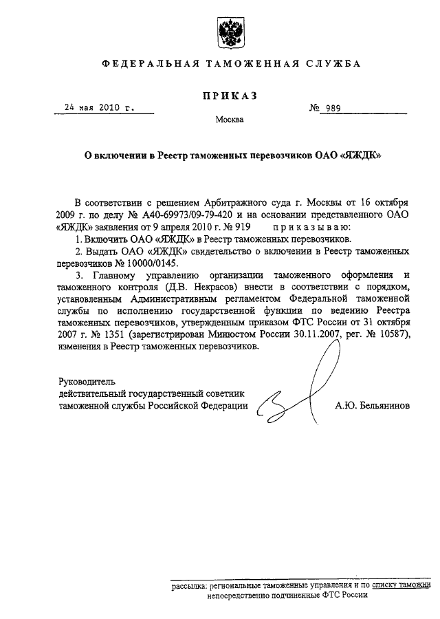 ПРИКАЗ ФТС РФ от 24.05.2010 N 989
