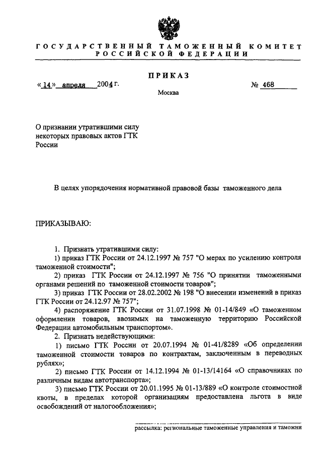 ПРИКАЗ ГТК РФ от 14.04.2004 N 468