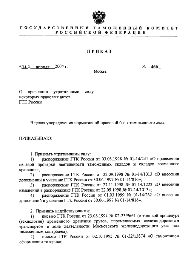 ПРИКАЗ ГТК РФ от 14.04.2004 N 465