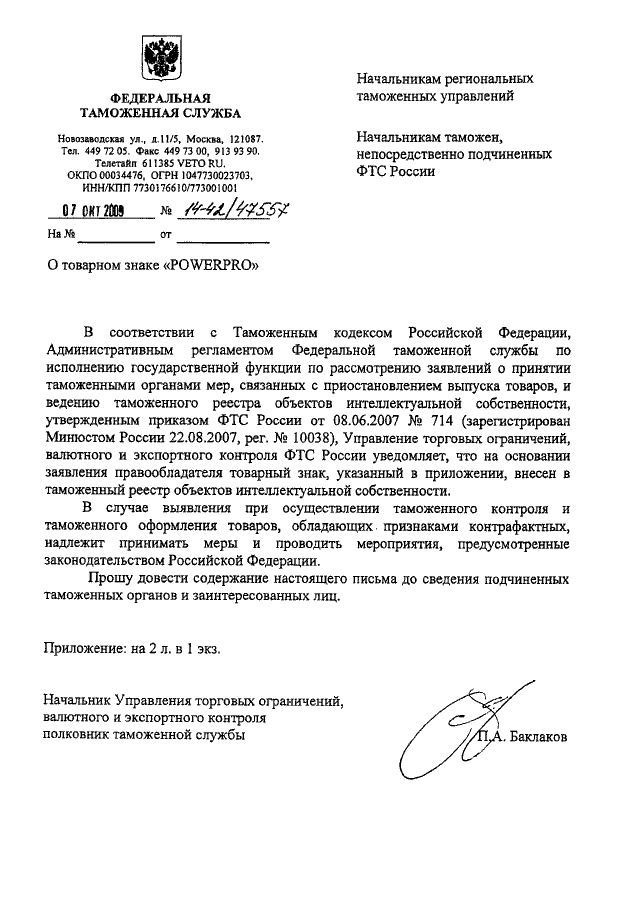 ПИСЬМО ФТС РФ от 07.10.2009 N 14-42/47557