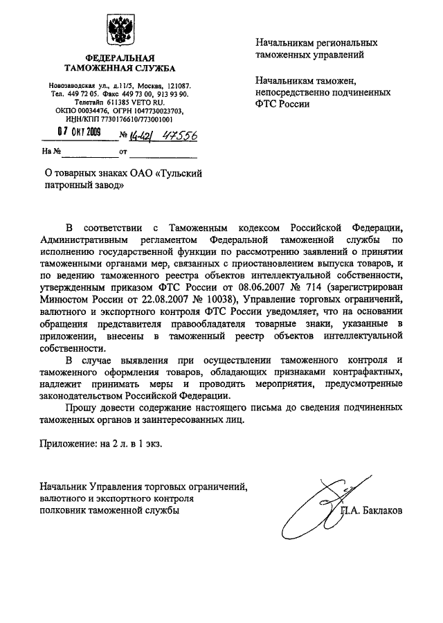 ПИСЬМО ФТС РФ от 07.10.2009 N 14-42/47556