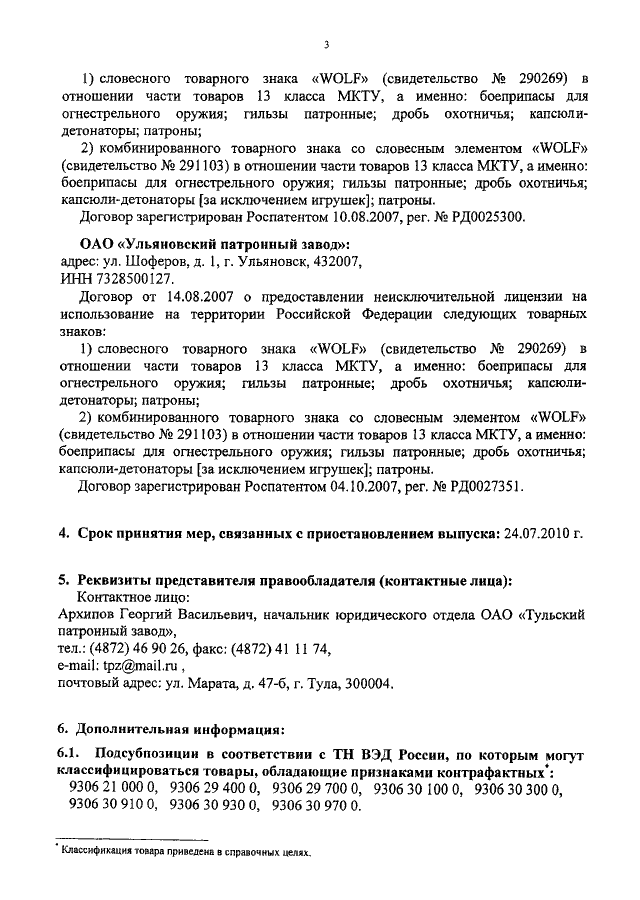 "О ТОВАРНЫХ ЗНАКАХ ОАО "ТУЛЬСКИЙ ПАТРОННЫЙ ЗАВОД"