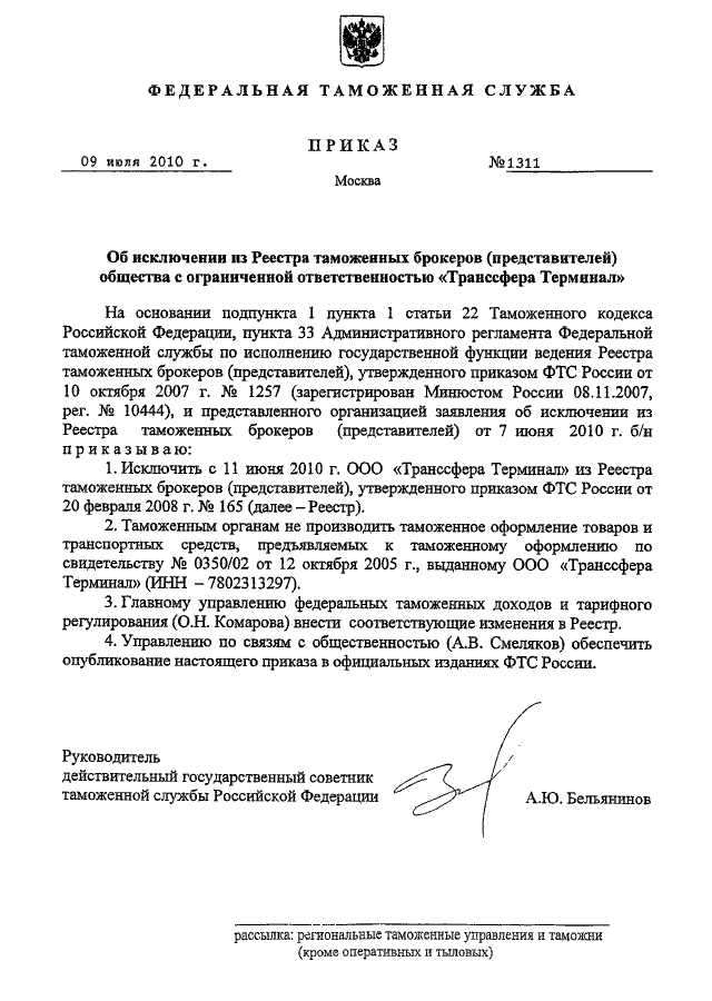 "ОБ ИСКЛЮЧЕНИИ ИЗ РЕЕСТРА ТАМОЖЕННЫХ БРОКЕРОВ (ПРЕДСТАВИТЕЛЕЙ) ОБЩЕСТВА С ОГРАНИЧЕННОЙ ОТВЕТСТВЕННОСТЬЮ "ТРАНССФЕРА ТЕРМИНАЛ"