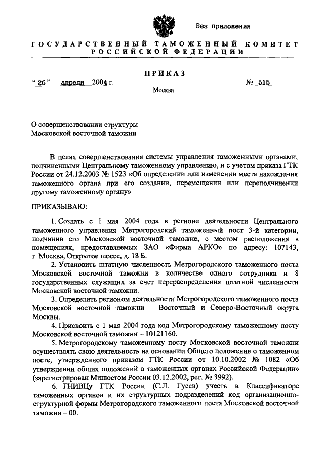 ПРИКАЗ ГТК РФ от 26.04.2004 N 515