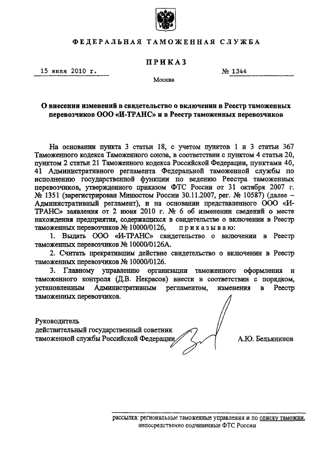 ПРИКАЗ ФТС РФ от 15.07.2010 N 1344