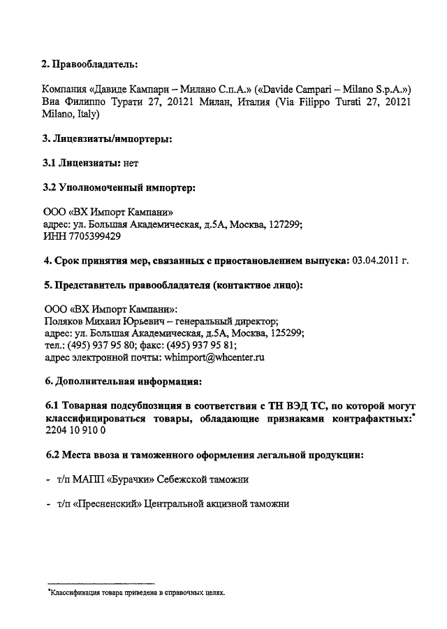 "О ТОВАРНЫХ ЗНАКАХ КОМПАНИИ "DAVIDE CAMPARI - MILANO S.P.A."