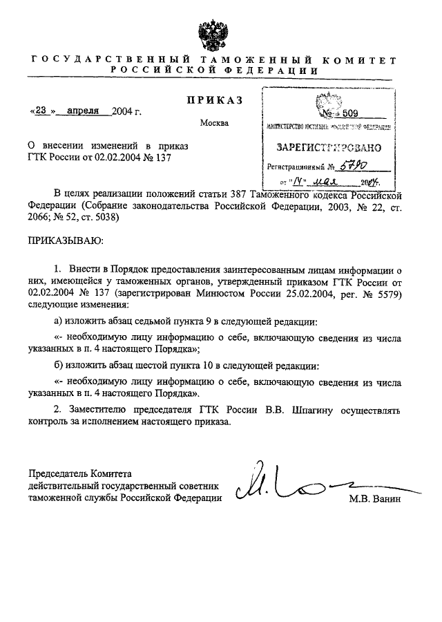 ПРИКАЗ ГТК РФ от 23.04.2004 N 509