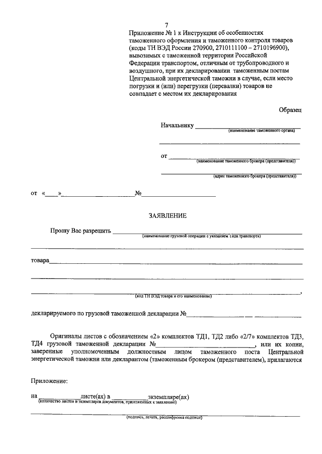 "ОБ УТВЕРЖДЕНИИ ИНСТРУКЦИИ ОБ ОСОБЕННОСТЯХ ТАМОЖЕННОГО ОФОРМЛЕНИЯ И ТАМОЖЕННОГО КОНТРОЛЯ ТОВАРОВ (КОДЫ ТН ВЭД РОССИИ 270900 И 2710111100 - 2710196900), ВЫВОЗИМЫХ С ТАМОЖЕННОЙ ТЕРРИТОРИИ РОССИЙСКОЙ ФЕДЕРАЦИИ ТРАНСПОРТОМ, ОТЛИЧНЫМ ОТ ТРУБОПРОВОДНОГО И ВОЗДУШНОГО, ПРИ ИХ ДЕКЛАРИРОВАНИИ ТАМОЖЕННЫМ ПОСТАМ ЦЕНТРАЛЬНОЙ ЭНЕРГЕТИЧЕСКОЙ ТАМОЖНИ В СЛУЧАЕ, ЕСЛИ МЕСТО ПОГРУЗКИ И (ИЛИ) ПЕРЕГРУЗКИ (ПЕРЕВАЛКИ) ТОВАРОВ НЕ СОВПАДАЕТ С МЕСТОМ ИХ ДЕКЛАРИРОВАНИЯ"