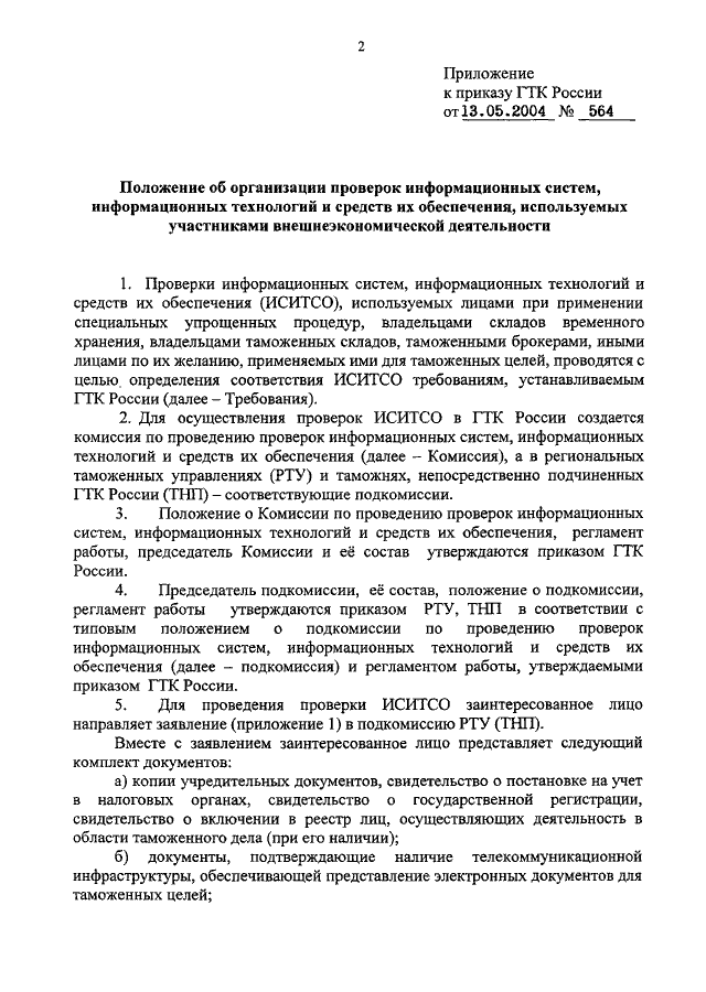 ПРИКАЗ ГТК РФ от 13.05.2004 N 564