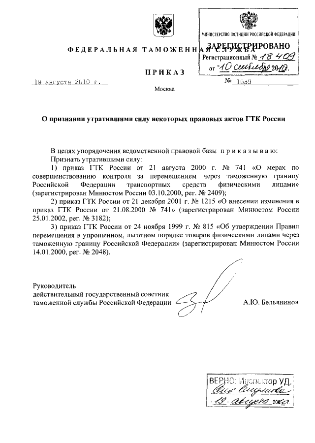 ПРИКАЗ ФТС РФ от 19.08.2010 N 1539