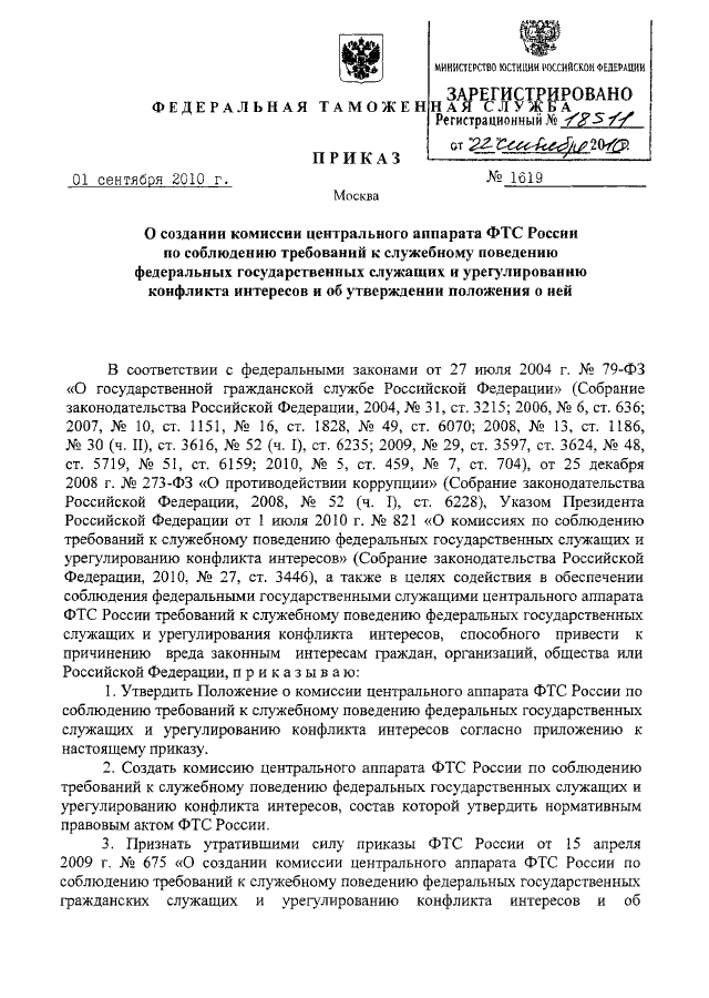 ПРИКАЗ ФТС РФ от 01.09.2010 N 1619