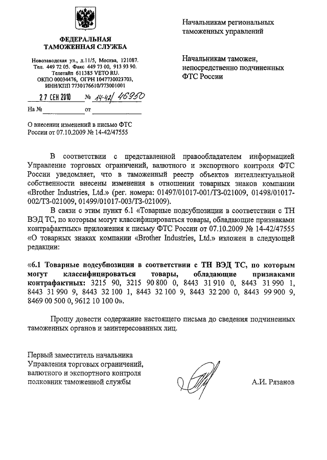 "О ВНЕСЕНИИ ИЗМЕНЕНИЙ В ПИСЬМО ФТС РОССИИ ОТ 07.10.2009 N 14-42/47555"