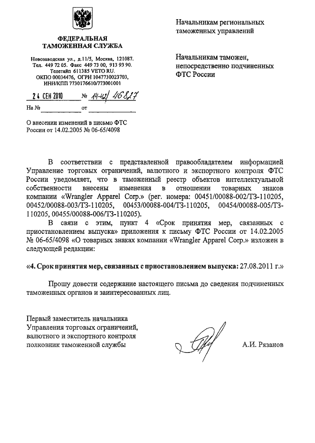 "О ВНЕСЕНИИ ИЗМЕНЕНИЙ В ПИСЬМО ФТС РОССИИ ОТ 14.02.2005 N 06-65/4098"