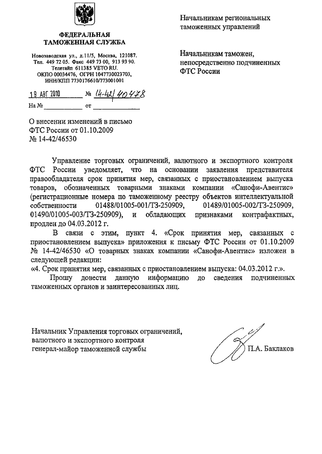 ПИСЬМО ФТС РФ от 19.08.2010 N 14-42/40478