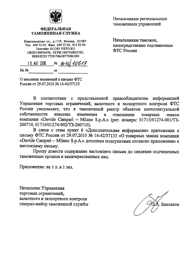 "О ВНЕСЕНИИ ИЗМЕНЕНИЙ В ПИСЬМО ФТС РОССИИ ОТ 29.07.2010 N 14-42/37135"