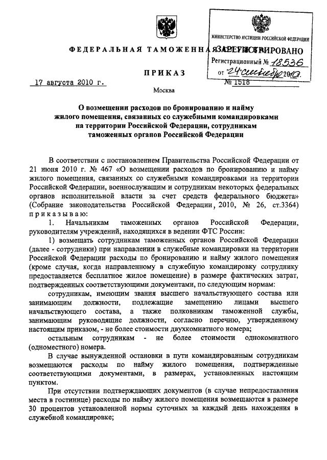 ПРИКАЗ ФТС РФ от 17.08.2010 N 1518 "О ВОЗМЕЩЕНИИ РАСХОДОВ ПО БРОНИРОВАНИЮ И НАЙМУ ЖИЛОГО ПОМЕЩЕНИЯ,