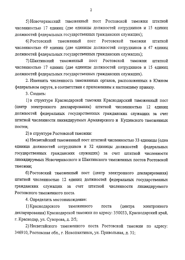 "О СОВЕРШЕНСТВОВАНИИ СТРУКТУРЫ ТАМОЖЕННЫХ ОРГАНОВ, РАСПОЛОЖЕННЫХ В ЮЖНОМ ФЕДЕРАЛЬНОМ ОКРУГЕ"