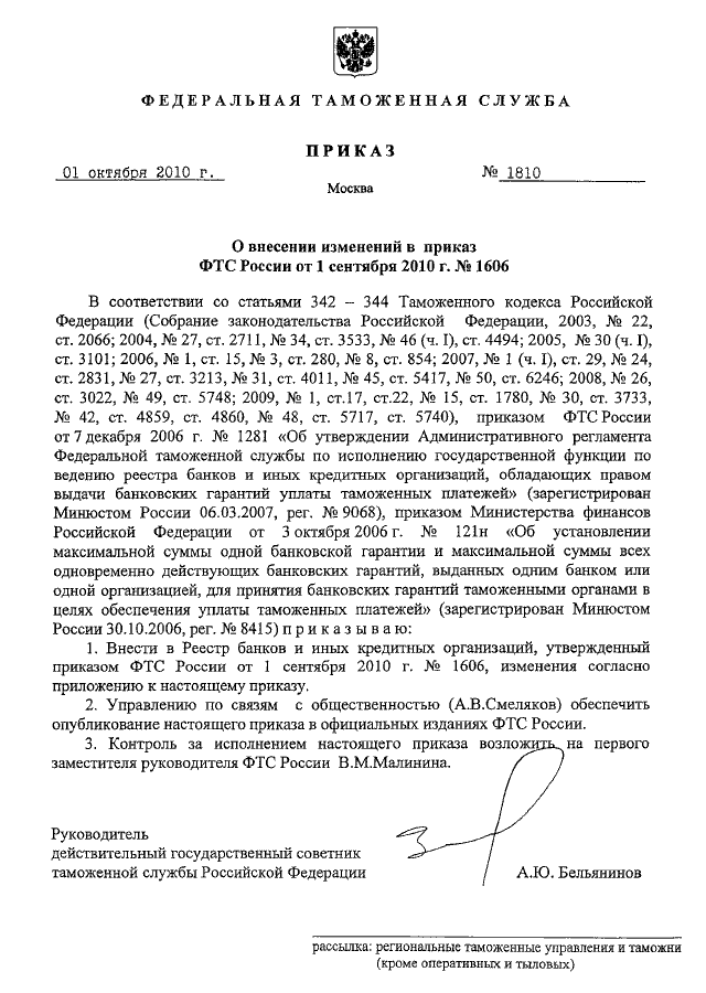 ПРИКАЗ ФТС РФ от 01.10.2010 N 1810