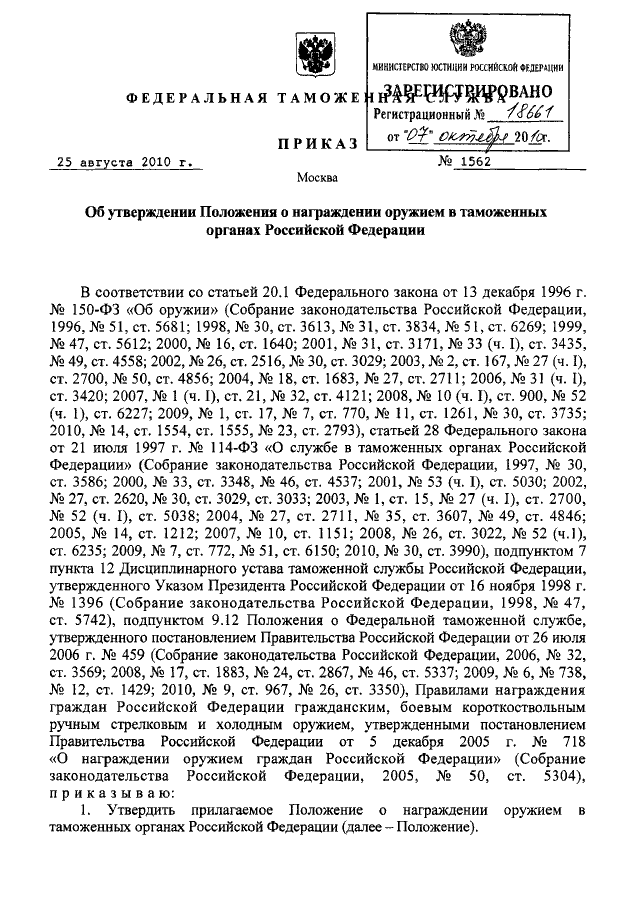 ПРИКАЗ ФТС РФ от 25.08.2010 N 1562